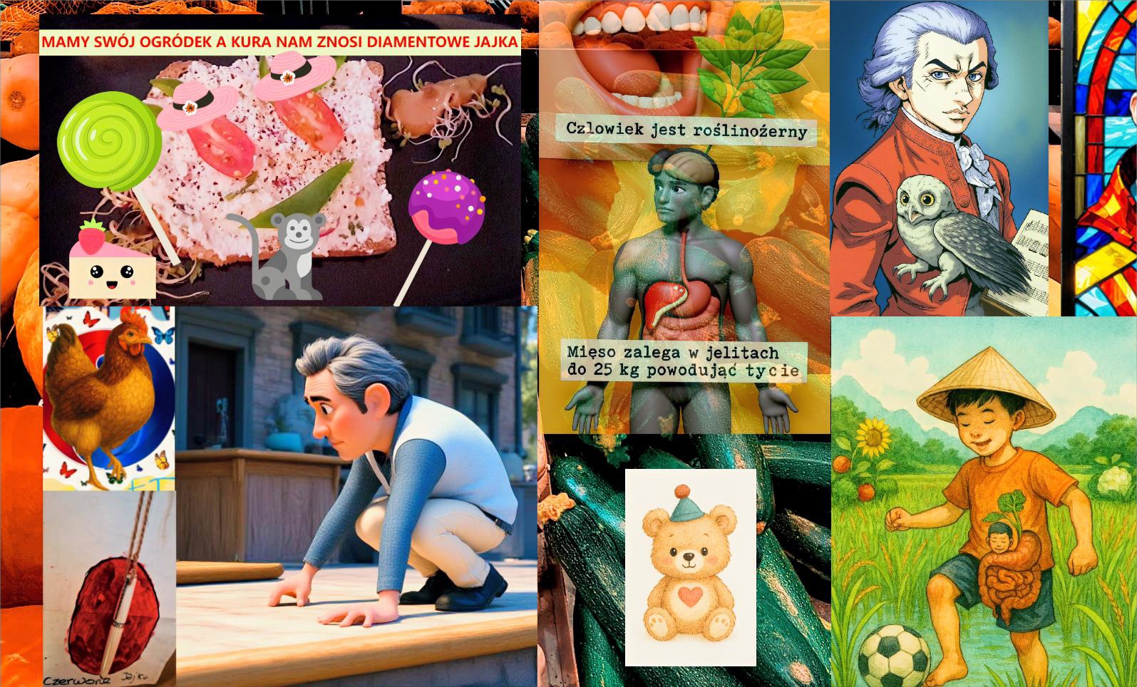To manifest powrotu do korzeni. Człowiek nie potrzebuje mięsa, by być silnym — wystarczy mu to, co daje ziemia. Nasze jelita nie są stworzone do trawienia zwłok, tylko do przyswajania życia. W tym kolażu pokazujemy, że wybór roślin to nie dieta — to filozofia. To wolność od przemysłu, od ciężaru, od iluzji. Wybieramy lekkość, energię, prawdę. Mamy swój ogródek — i to nam wystarcza.