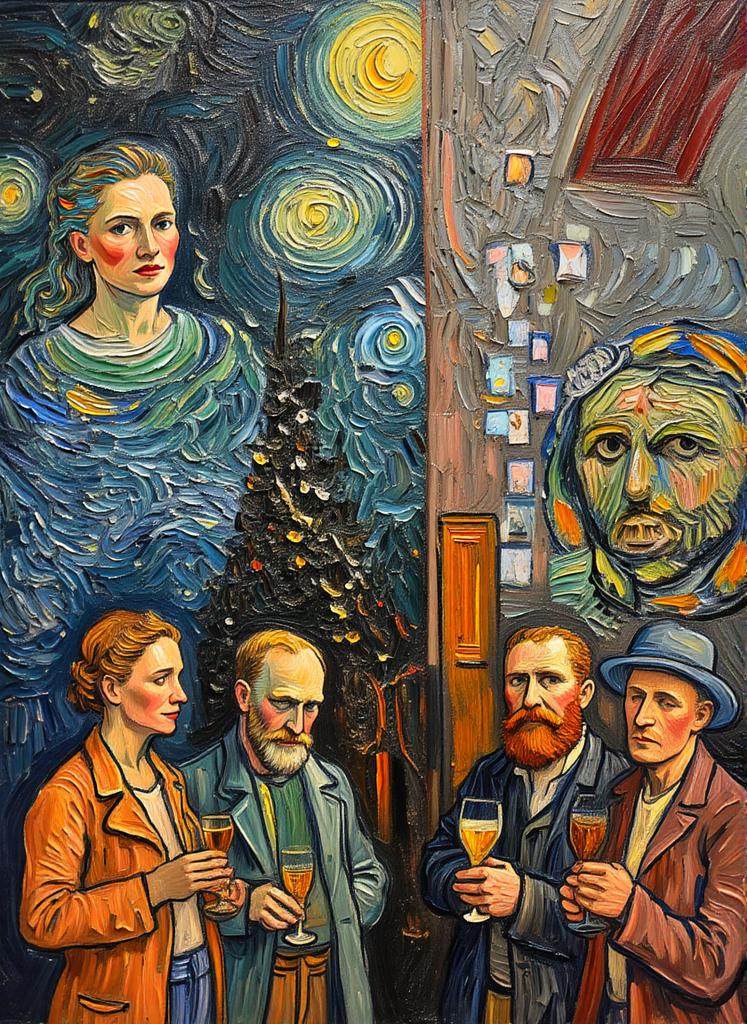 „Van Gogh come back” to kolaż, w którym codzienność miesza się z malarską magią. Portrety, kot, filiżanka, panna młoda i małpka z misiem – wszystkie te obrazy zdają się pulsować energią pociągnięć pędzla, jakby mistrz Vincent wrócił, by na nowo malować nasze historie. W każdym z nas jest coś z Van Gogha – od odrobiny szaleństwa, przez zachwyt nad drobiazgami, po pragnienie uchwycenia światła i koloru w ulotnej chwili.