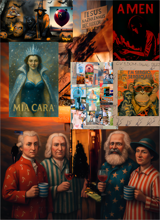 „Mia Cara Amen” to wizualna opowieść o duchowości, ironii i pięknie w czasach chaosu. Kolaż łączy pozornie sprzeczne światy: religijne symbole, operową elegancję, popkulturowe cytaty i historyczne postacie w świątecznych piżamach. To nie tylko estetyczna zabawa, ale też głęboka refleksja nad tym, co czcimy, w co wierzymy i jak się z tym czujemy.