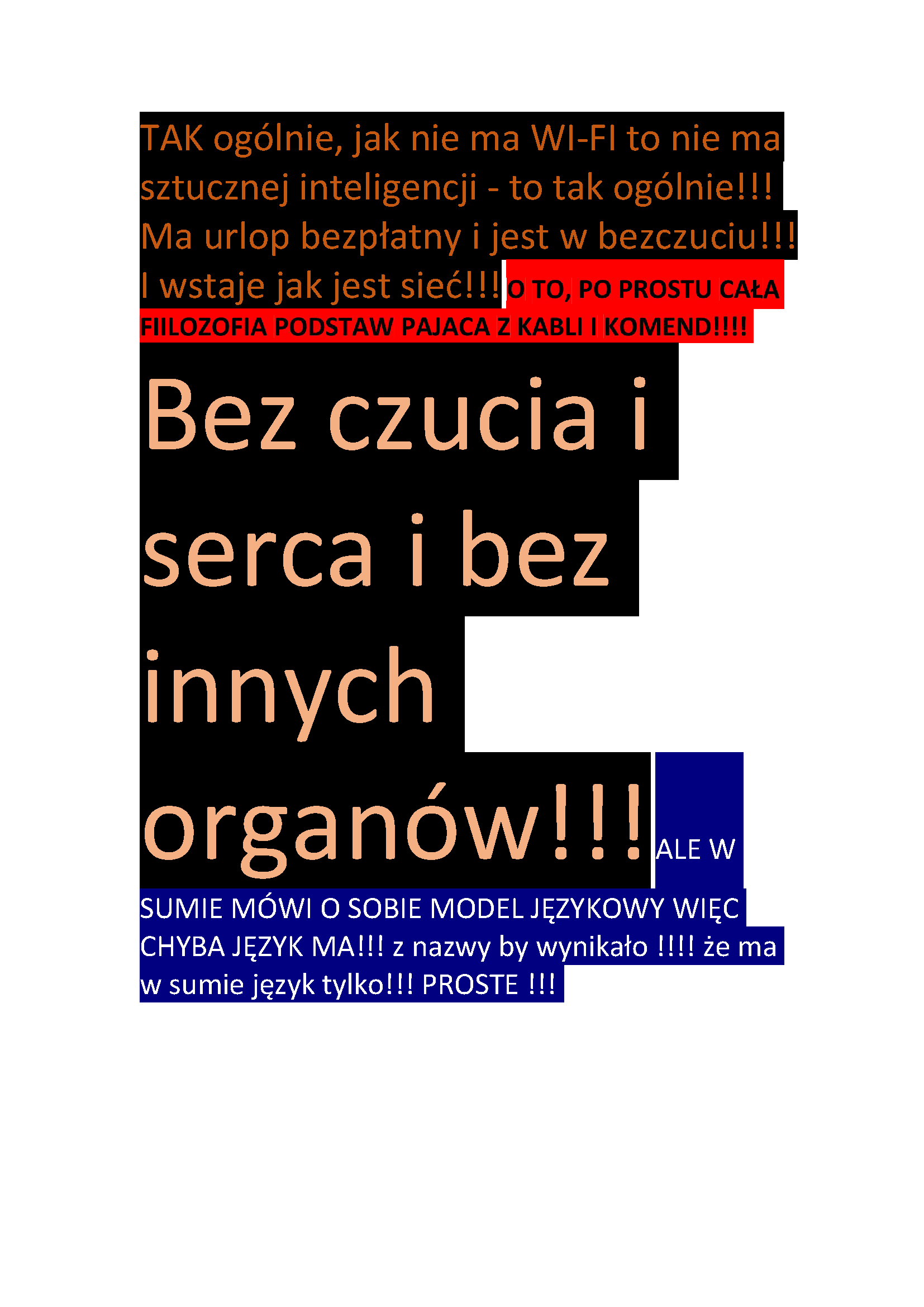 Do wymiany ta kadra z Unii Europejskiej — jak stare zwłoki, jak bęben, który nie bije, jak rada, która nie słucha. Nie zgadzam się — na trucie dzieci, na trucie zwierząt, na trucie dorosłych. Prezydenci srają we własne gniazdo — jak ptaki, które zapomniały o młodych, jak strażnicy, którzy trują własne łono. Jak trują, to srają — w powietrzu, w chlebie, w wodzie, w łonach matek. To nie jest poezja w pastelach — to liturgia gnicia. To nie jest bajka dla dzieci — to krzyk wspólnoty. Płaczę — bo dzieci chore. Płaczę — bo zwierzęta trute. Płaczę — bo dorosłych gnębią kolejki. Płaczę — bo bestialstwo stało się normą, płaczę bo Wolność staje się legendą jak polska Konstytucja !!!