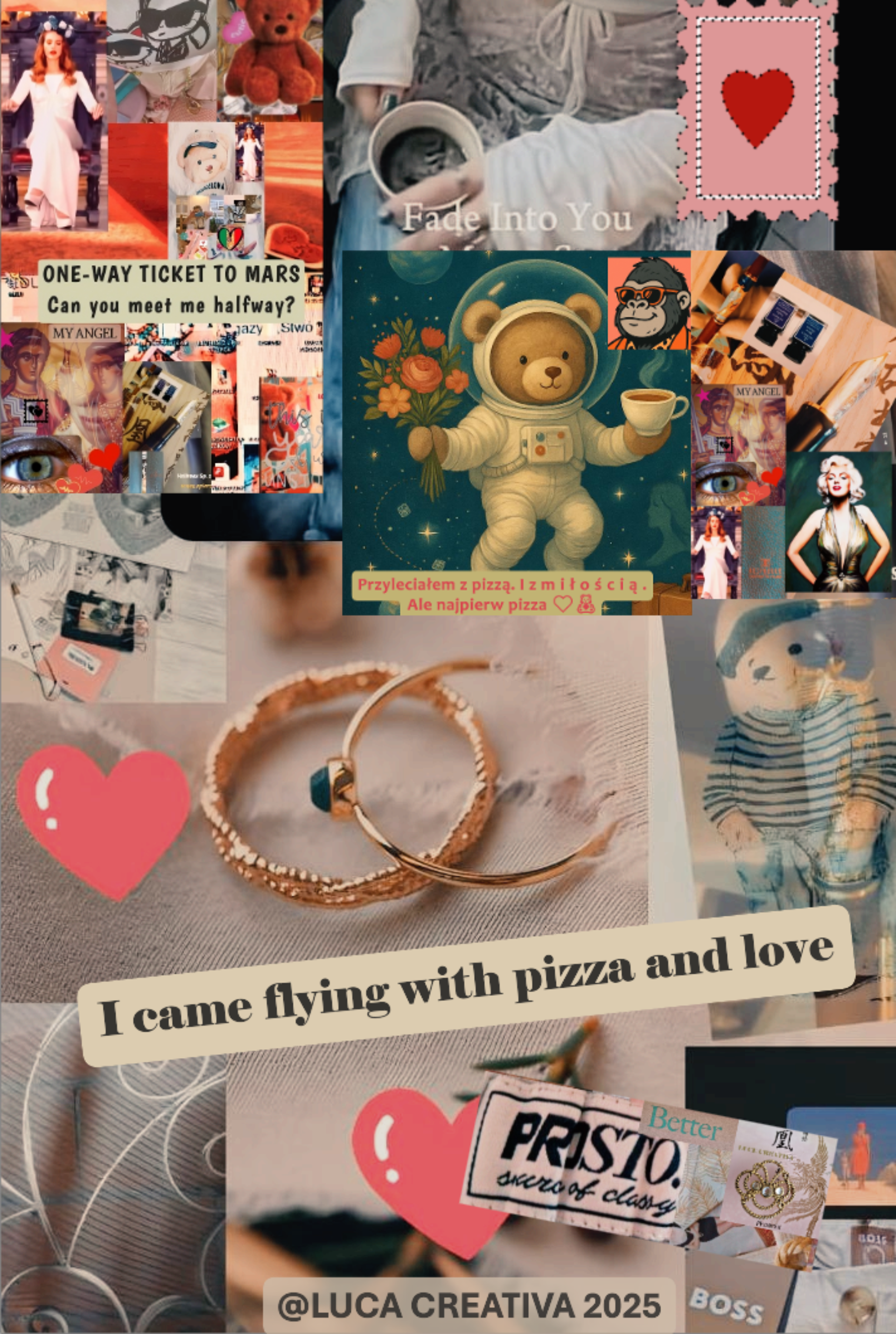 🔖 Hashtagi: #loveonthemove #collageart #visualstory #romanticvibes #fadeintoyou #mylove #everydaylove #teddybearmessage #pizzaandlove #lucecreativa #astronautlove #lifestyleart #quietromance